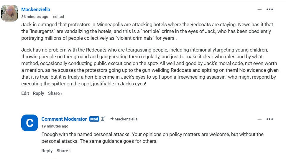 You might be wondering (or not) who the redcoats are. The identifier came about when the anonymous prolific poster, who calls himself Jack Bauer, expressed outrage that I called the 3000 ICE agents that descended on Minneapolis “invaders,” so I said, How about if we call them ‘redcoats’ instead, since they are being sent into blue cities across America. “Redcoats” is also appropriately analogous to the colonial days when the British army occupied the colonies and tried to disarm the colonists, which is why we have the “right to bear arms” in the Second Amendment of the US Constitution.