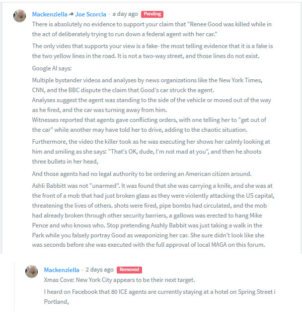 Ironically, the Disqus moderators’ new rules were personally adressed to me in the comments section of a Letter to the Editor, titled 'You don’t treat people like this,' which refers to the way ICE treats the population in general. It is not just about how ICE treats the undocumented, the immigrant, or the person of color. The victims of ICE’s public executions were American citizens. The rhetorical response of the far right is that it is the victim’s fault that they were executed for exercising their First and Second Amendment constitutional rights. If you don’t want to be murdered, then don’t protest ICE is the argument that MAGA stands on.
